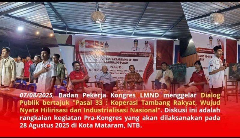 Dialog tersebut menghadirkan empat narasumber kompeten, yakni Kepala Dinas Koperasi dan UMKM NTB Ahmad Masyhuri, Akademisi Fakultas Ekonomi Unram Iwan Harsono, Pemerhati Lingkungan Aryana Perdana Putra, serta Wakil Sekjen Eksekutif Nasional LMND Bidang Ideologi, Fikrin.