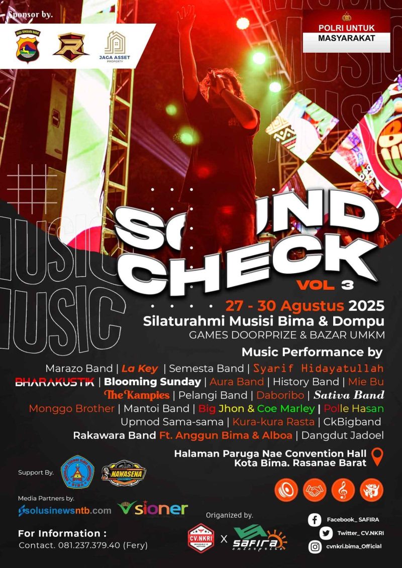 Kota Bima, Solusinewsntb.- Dalam rangka memperingati HUT Kemerdekaan RI ke-80 sekaligus mempererat silaturahmi antar musisi, CV NKRI menggelar acara bertajuk Sound Check Bima-Dompu. Kegiatan ini berlangsung di Paruga Nae Convention Hall, 27–30 Agustus 2025.