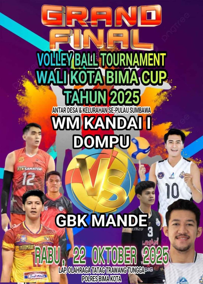 Kota Bima,Solusinewsntb. – Partai puncak Grand Final Volly Ball Wali Kota Cup I Kota Bima dipastikan bakal berlangsung panas dan spektakuler. Dua tim terbaik, WM Kandai Dompu dan GBK Mande, sama-sama menghadirkan pemain bertaraf nasional untuk memperebutkan gelar juara malam ini di Lapangan Olahraga Tatag Trawang Tungga Polres Bima Kota, Rabu (22/10/2025).